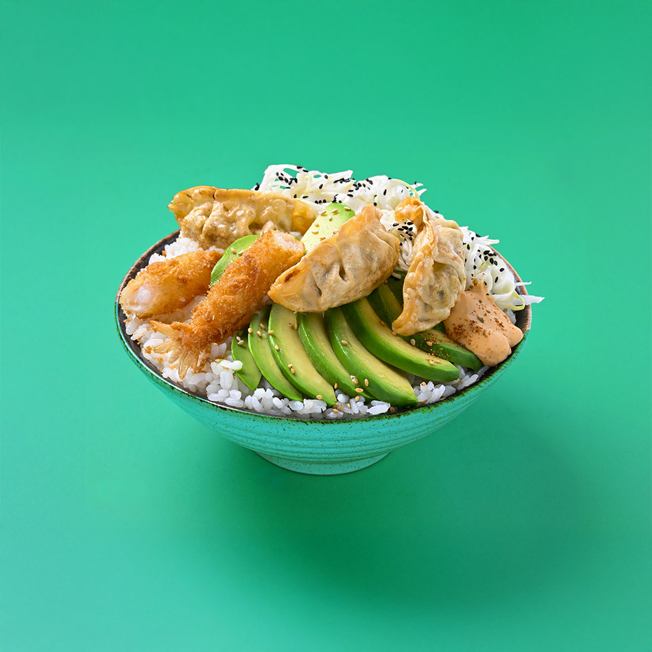 POULET KATSU, SALADE, MENTHE CONCOMBRE, AVOCAT, TOMATE, CORIANDRE.