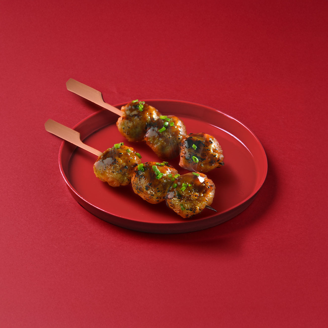 BROCHETTES DE BOULETTES DE POULET & POIREAU, GINGEMBRE, OIGNON.