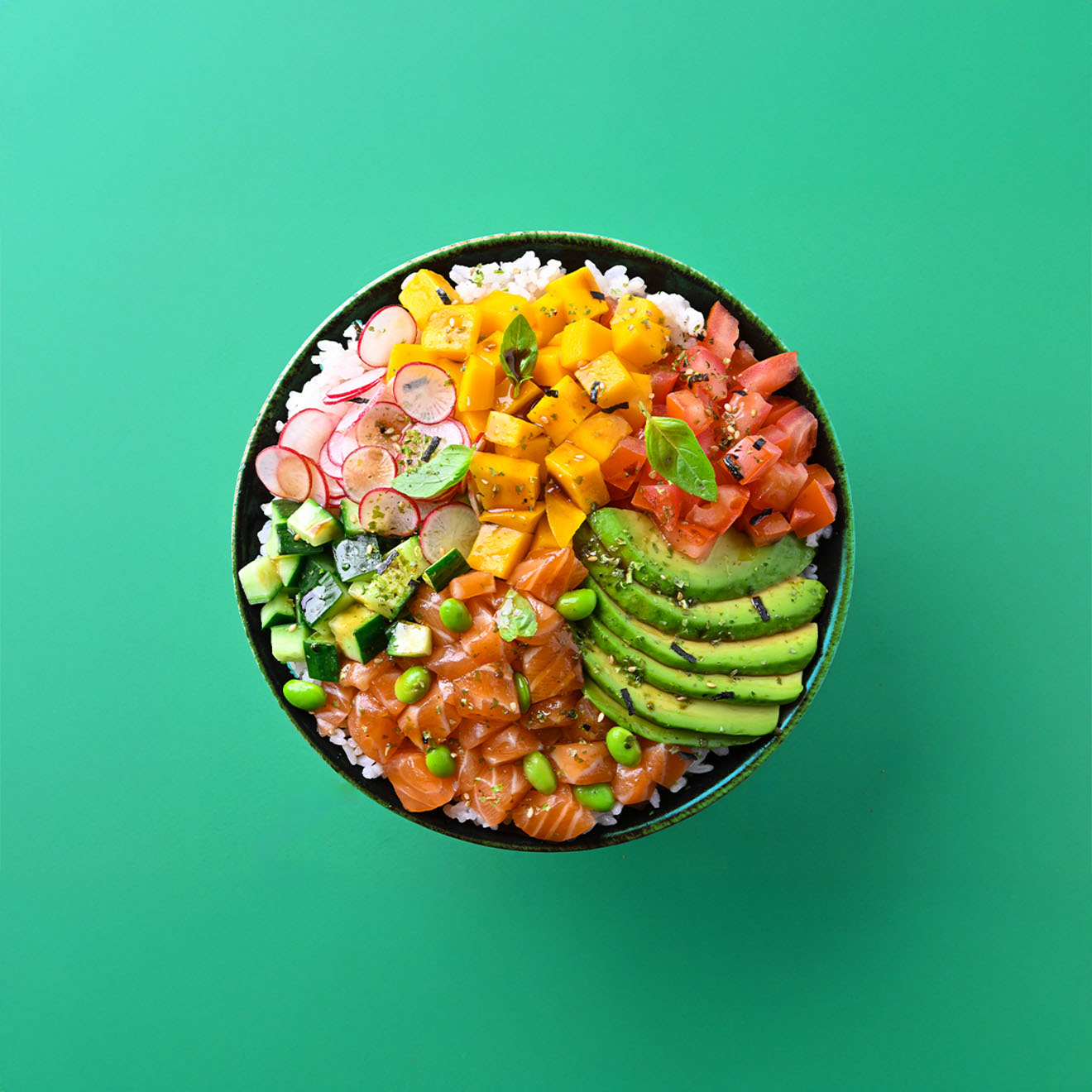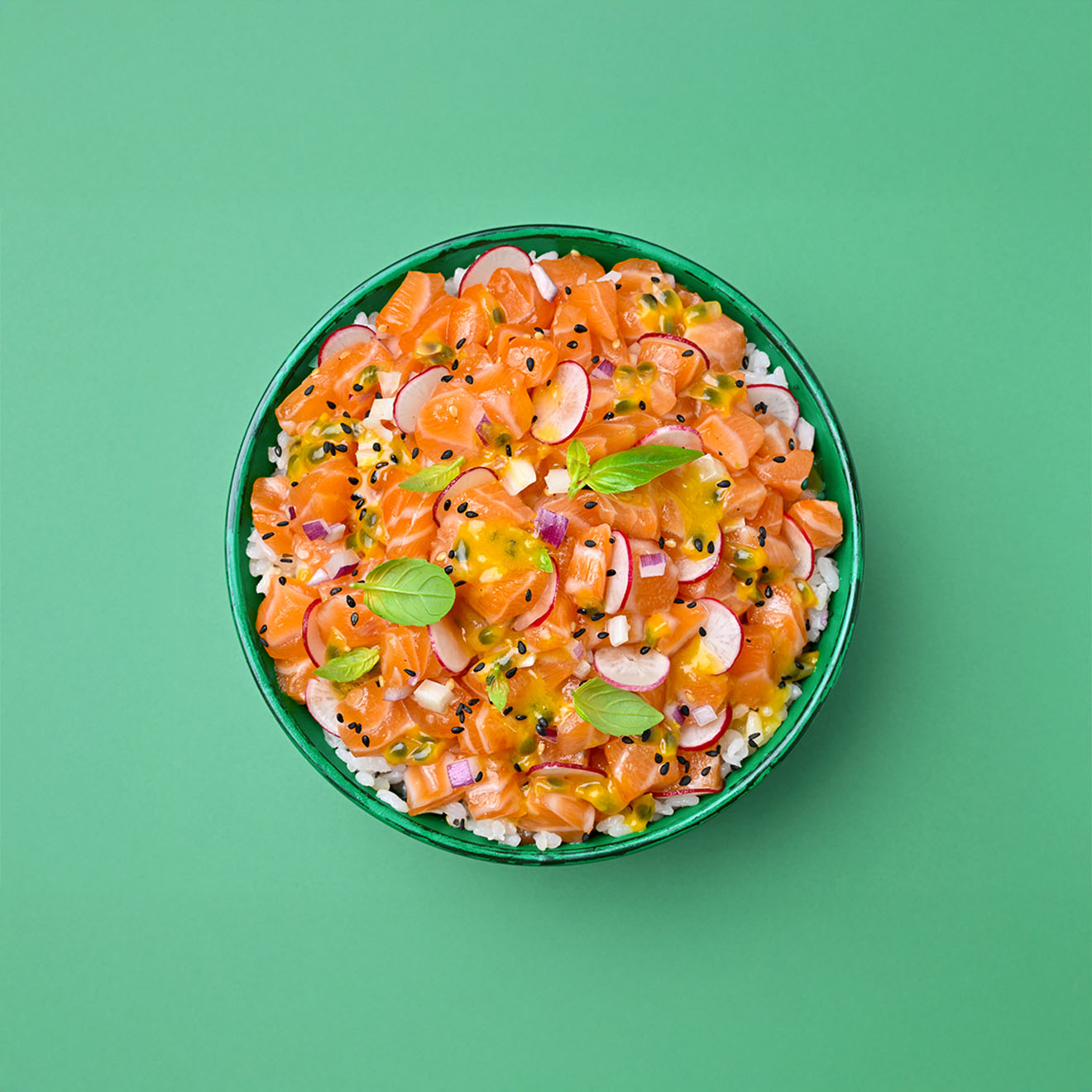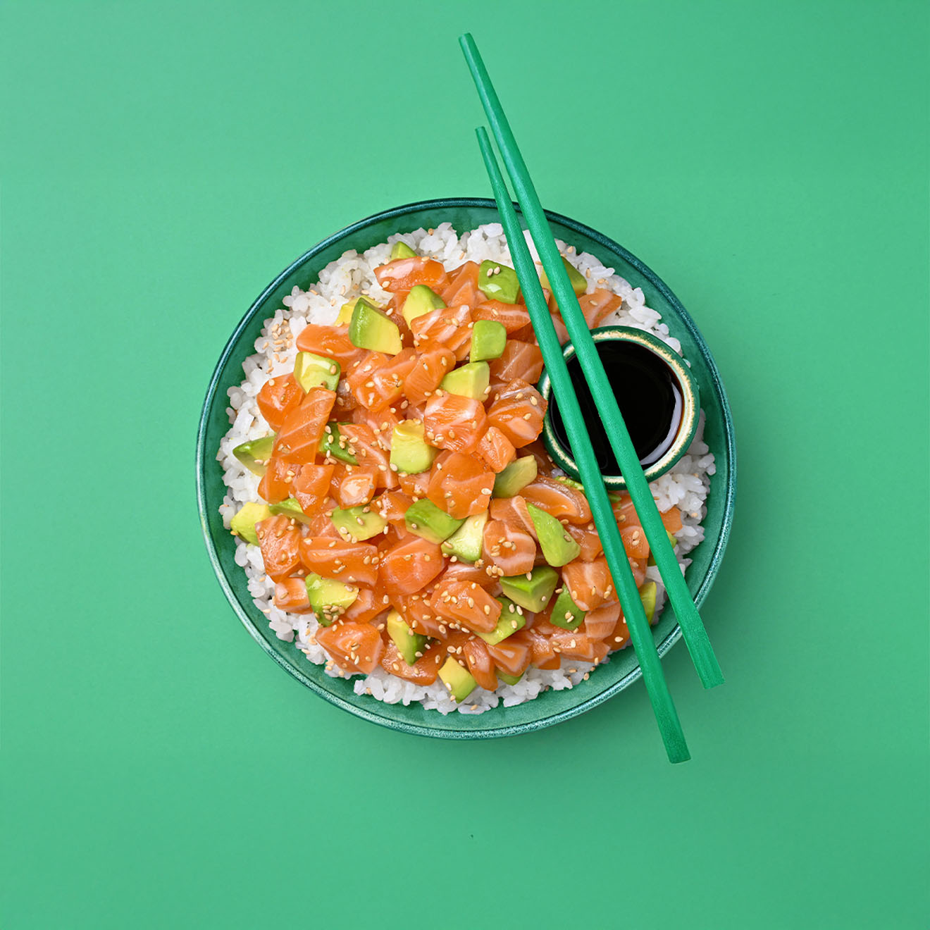 DÉS DE SAUMON & AVOCAT, GRAINES DE SÉSAME, RIZ VINAIGRÉ.