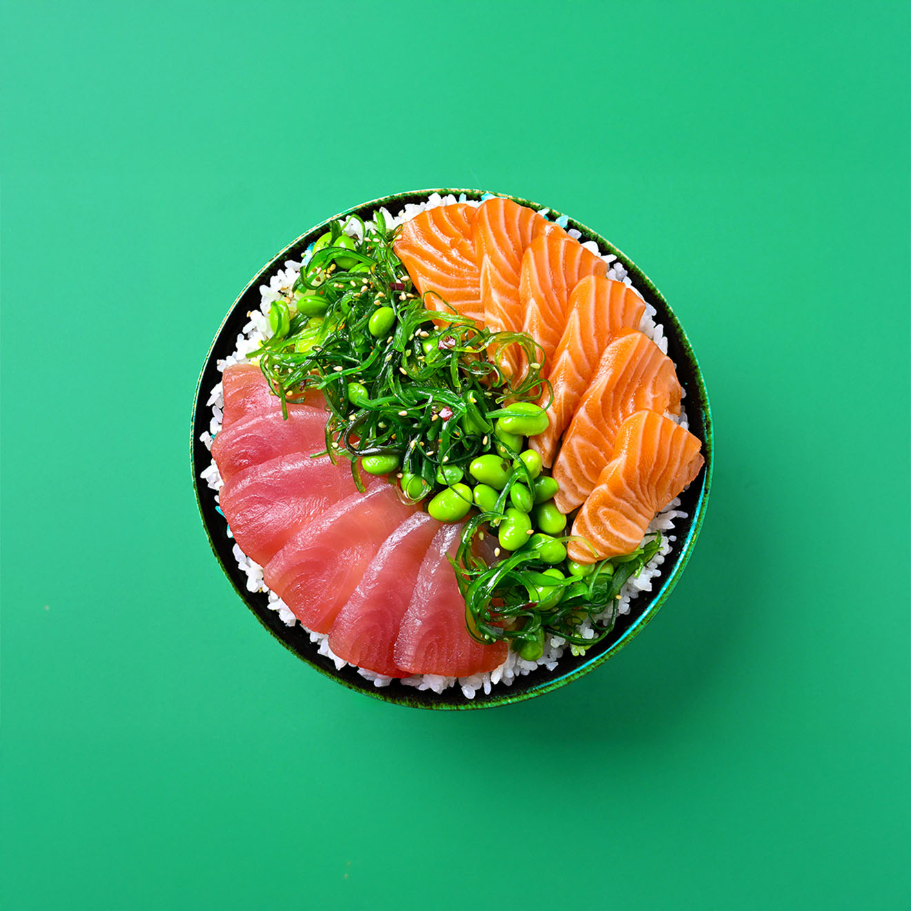 THON MARINÉ À L’HUILE DE SÉSAME SAUMON, AVOCAT, SPICY MAYO, SÉSAME, TOBIKO & SAUCE SOJA.