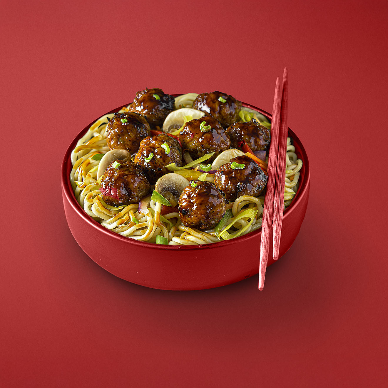 NOUILLES DE BLÉ, BOULETTES DE POULET SATAY, POIVRON,