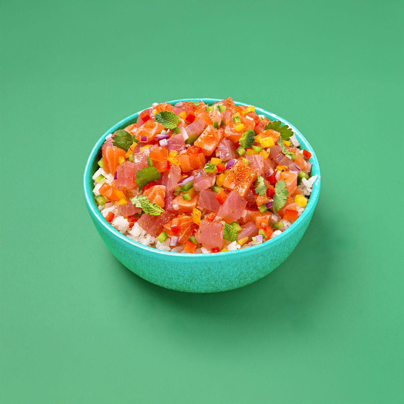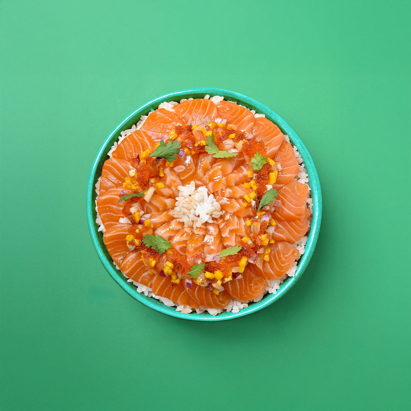 SAUMON, OIGNON FRIT, AVOCAT, CONCOMBRE, SPICY MAYO, HUILE DE SÉSAME.