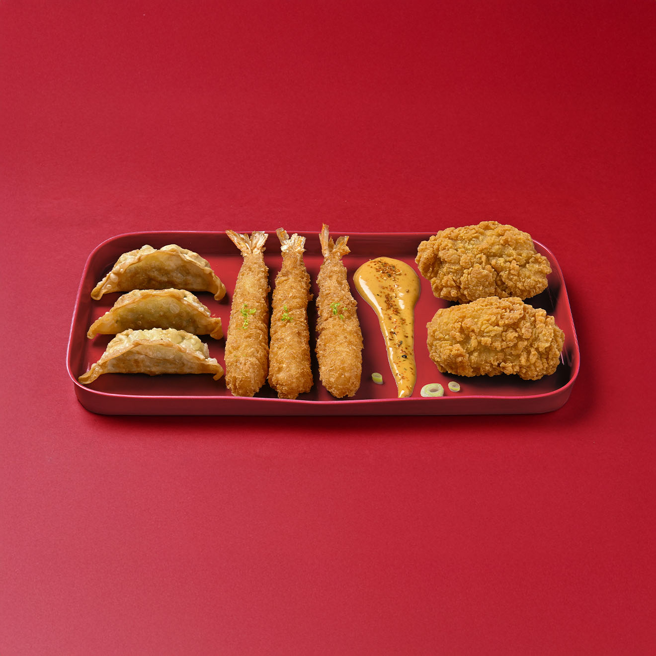 FEUILLE DE GYOZA, CREVETTE SPICY, CORIANDRE, OIGNON ROUGE, POIVRON, GUACAMOLE FAIT MAISON, TOBIKO & SPICY MAYO.