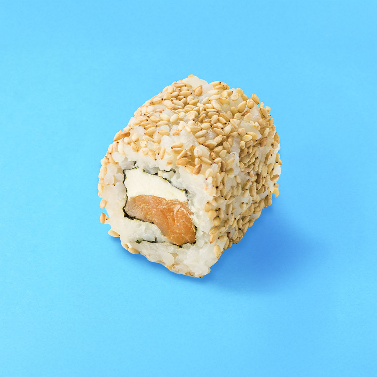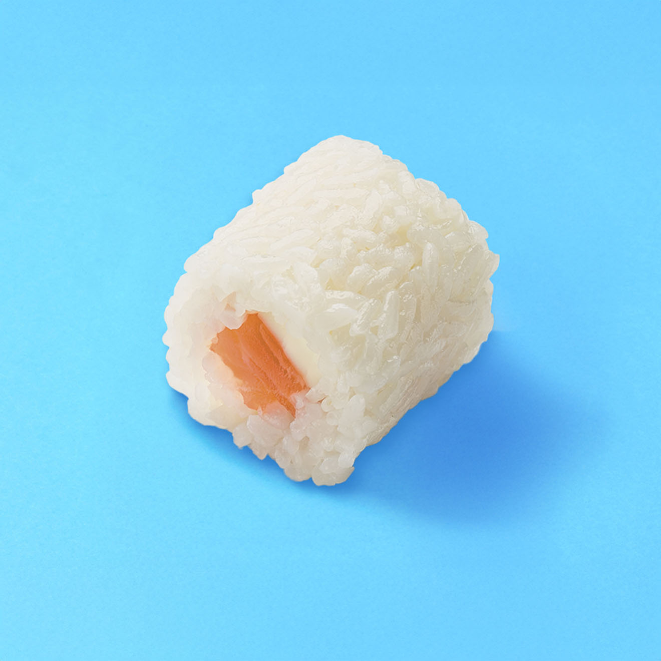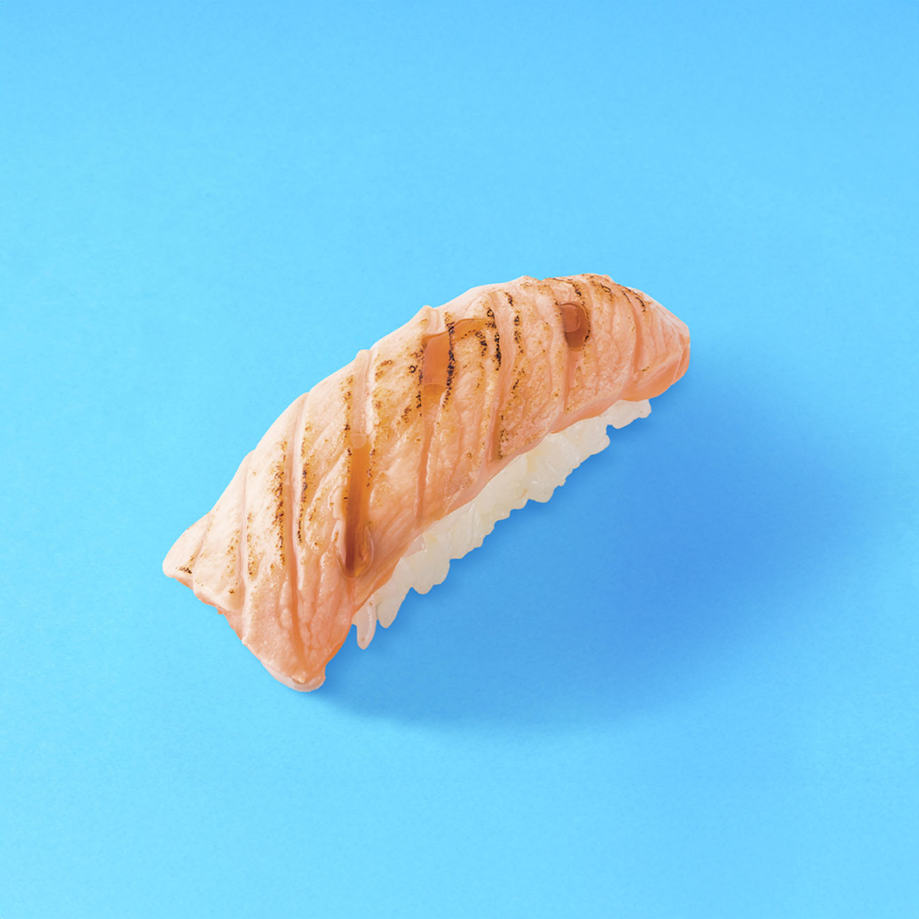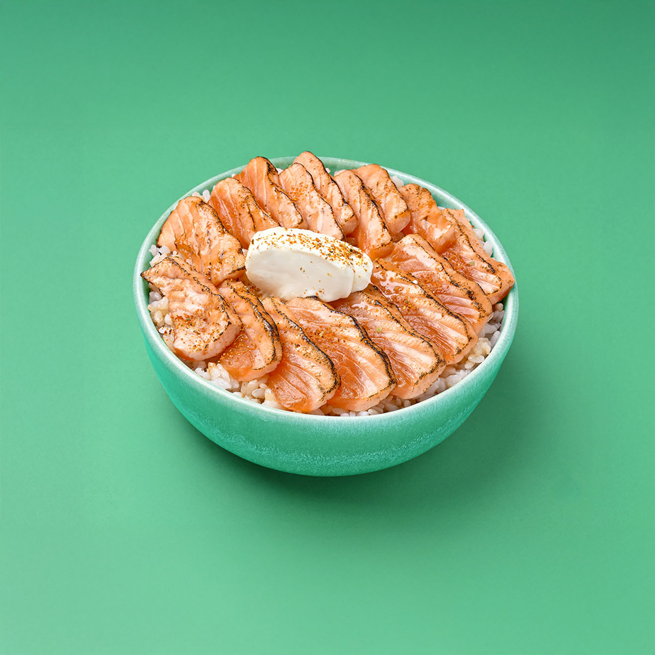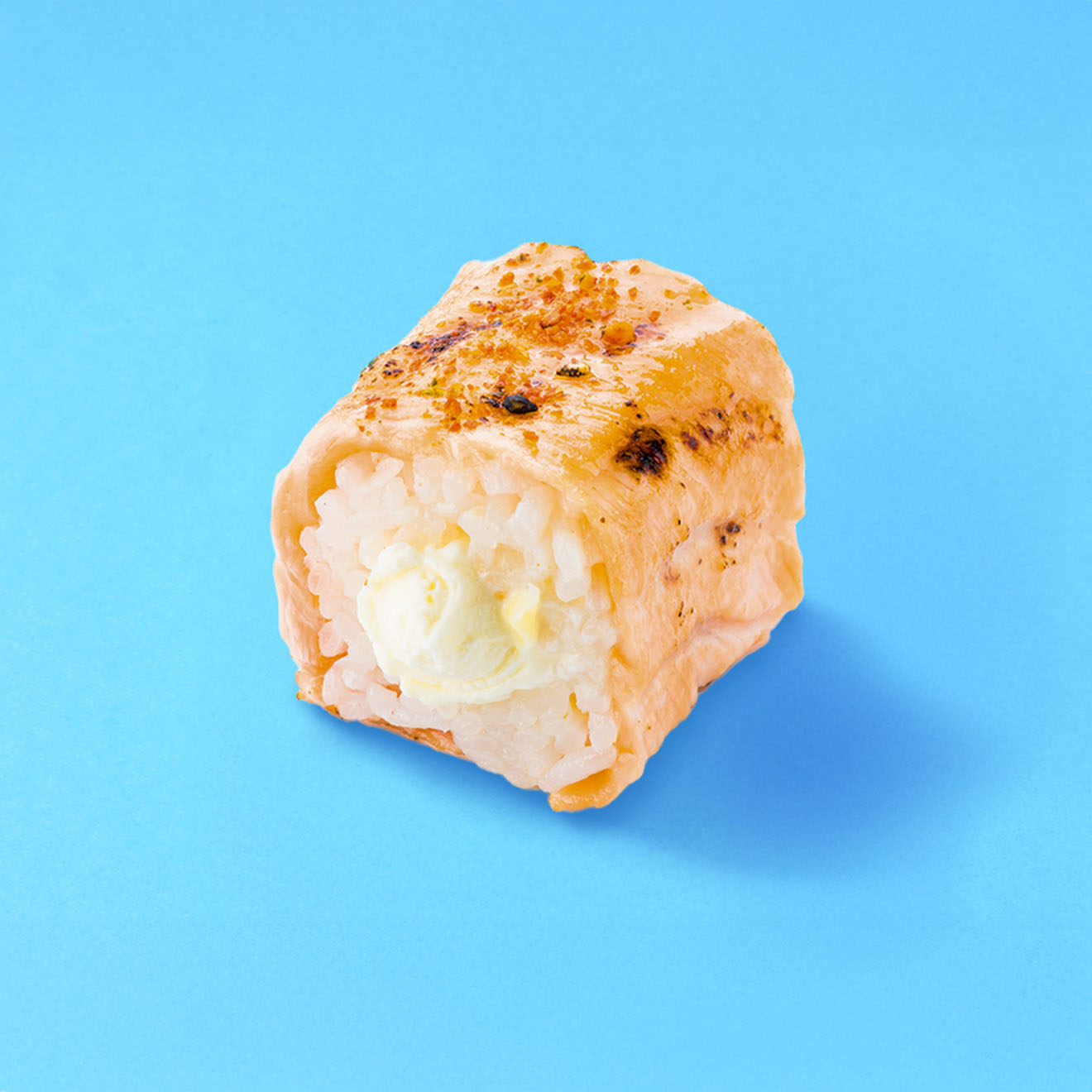 TRANCHES DE SAUMON MI-CUIT, CREAM CHEESE, SAUCE TERIYAKI, ÉPICES SHICHIMI, RIZ VINAIGRÉ.