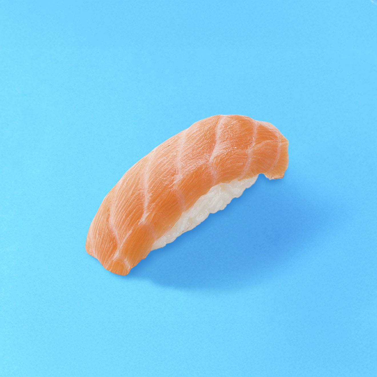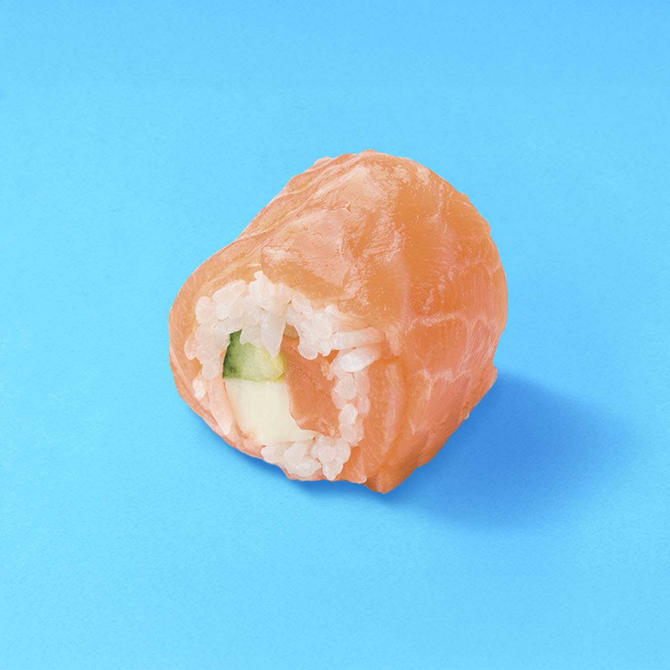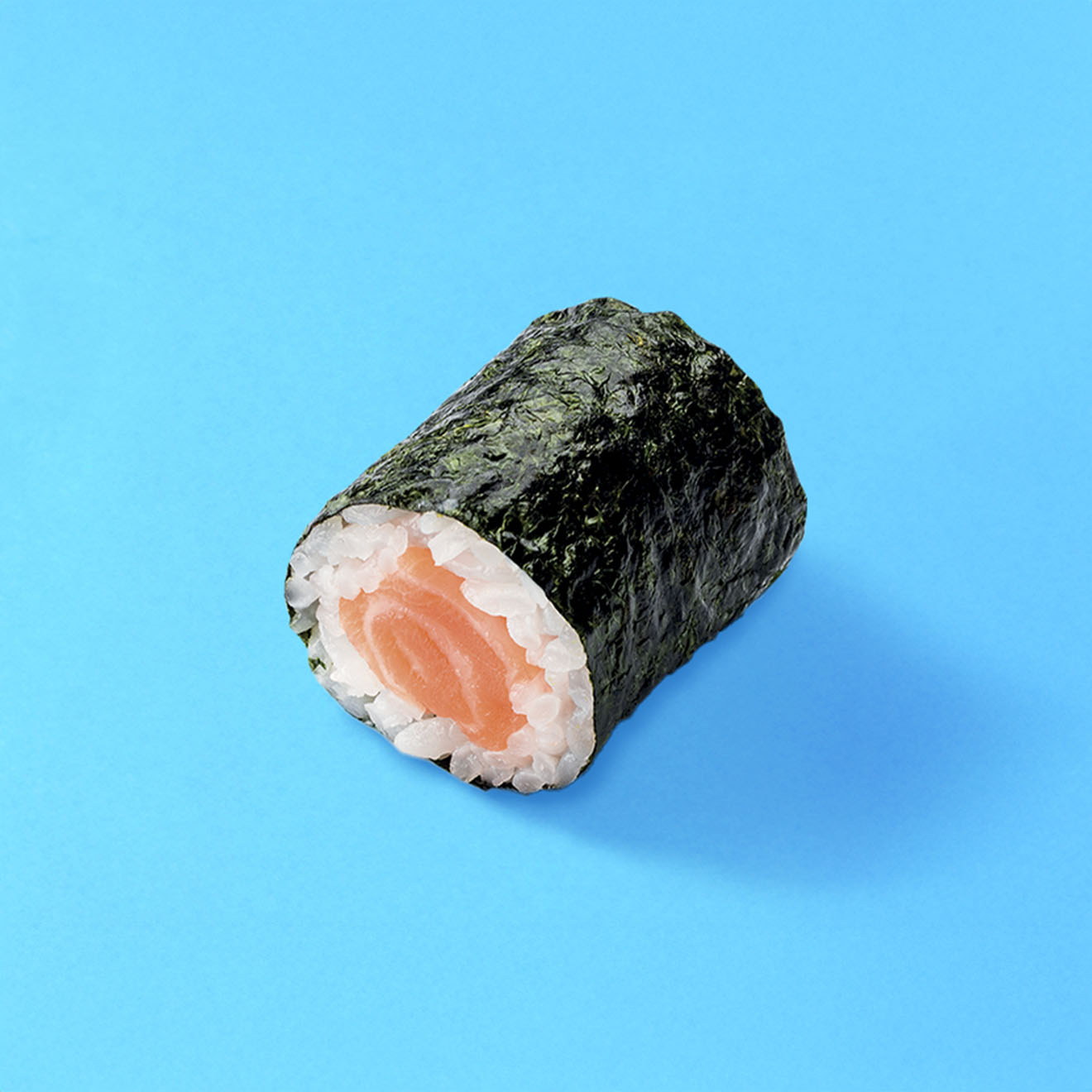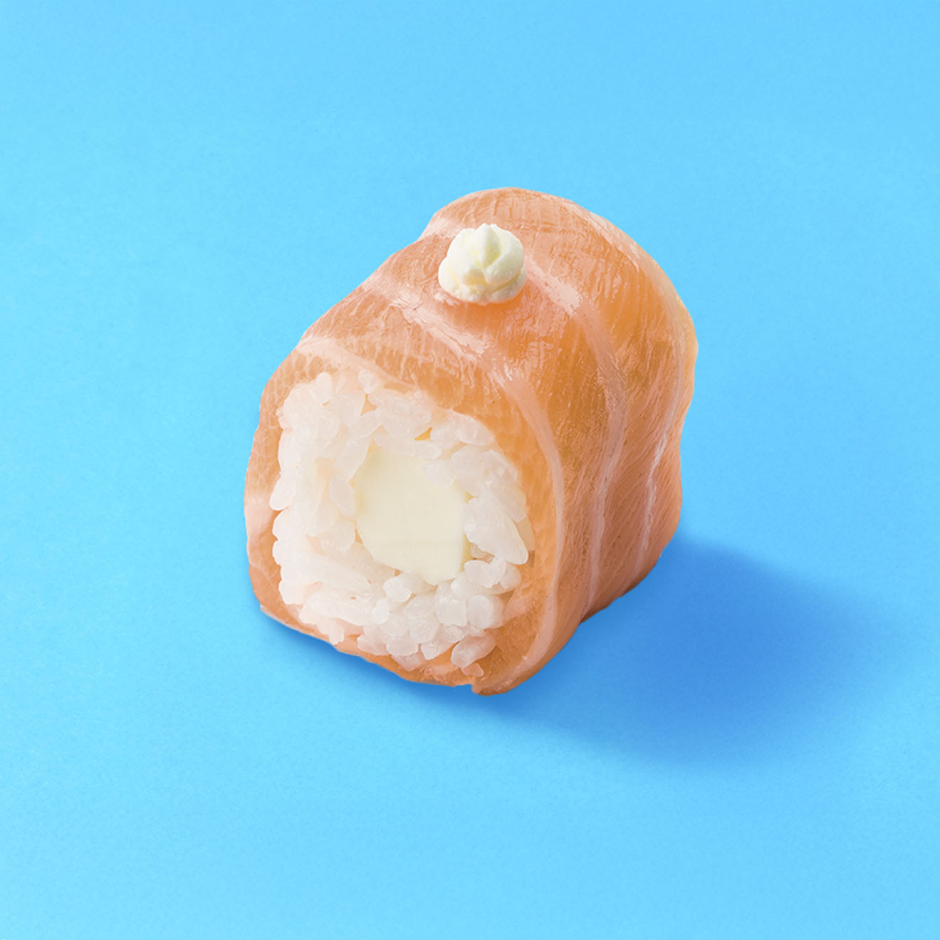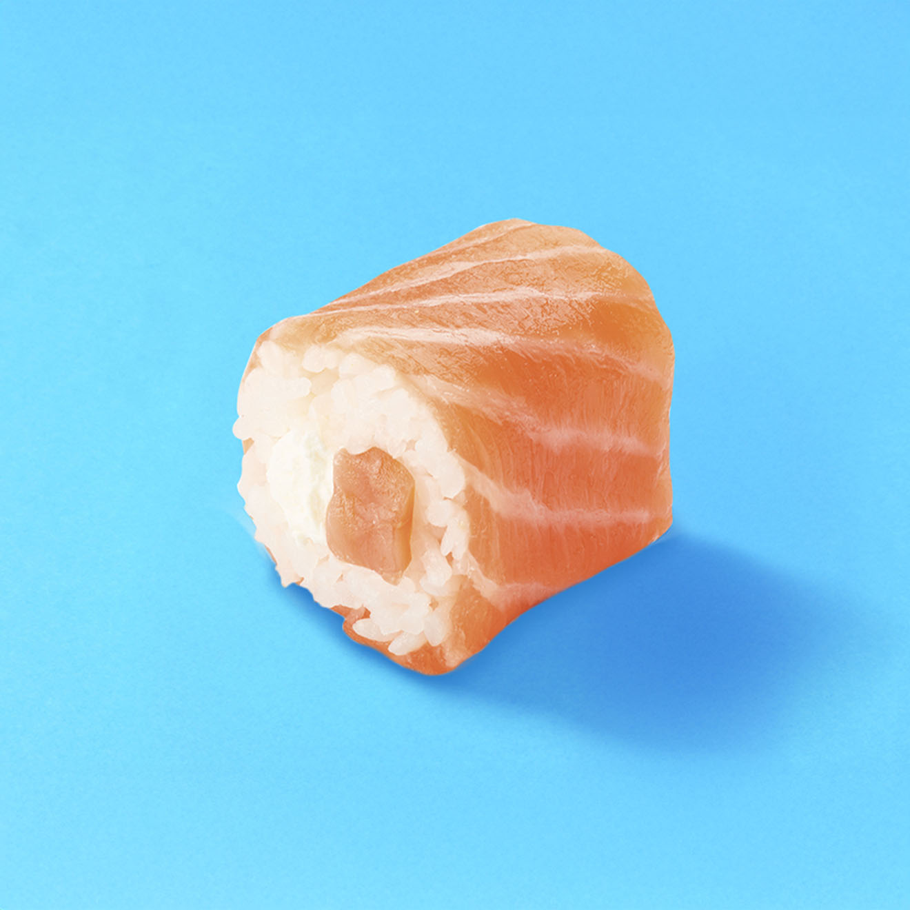 TRANCHES DE SAUMON MI-CUIT, CREAM CHEESE, SAUCE TERIYAKI, ÉPICES SHICHIMI, RIZ VINAIGRÉ.