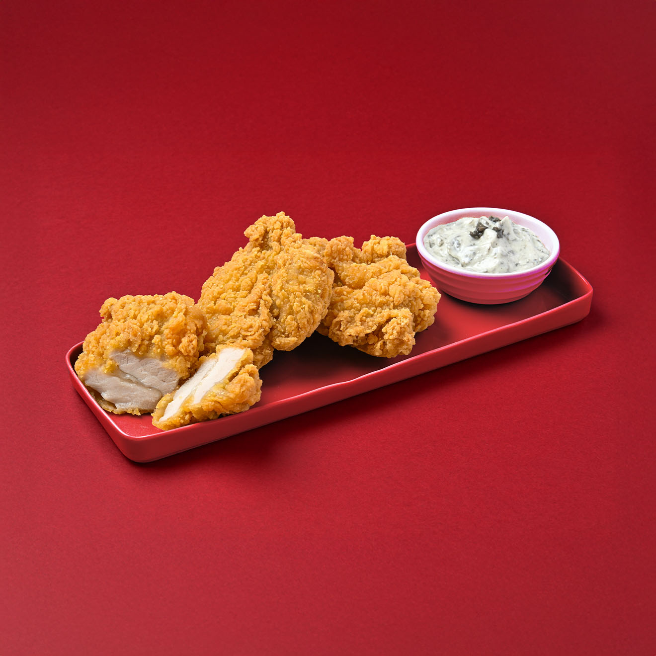 MORCEAUX DE BLANC DE POULET AUX ÉPICES & SAUCE MAYONNAISE À LA TRUFFE.