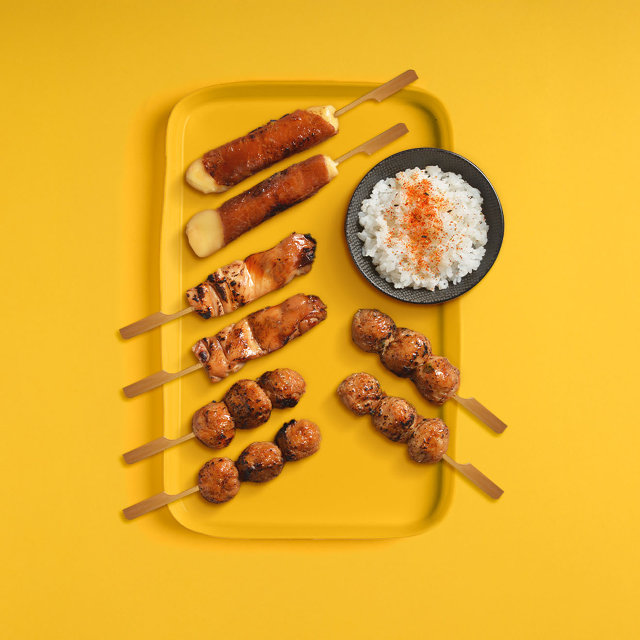 3 BROCHETTES AU CHOIX + 1 BOL DE RIZ NATURE OU 4 CALIFORNIA CREVETTE AVOCAT FROMAGE, 4 CALIFORNIA SAUMON OU 3 MORCEAUX DE POULET FRIT + 1 BOL DE RIZ NATURE