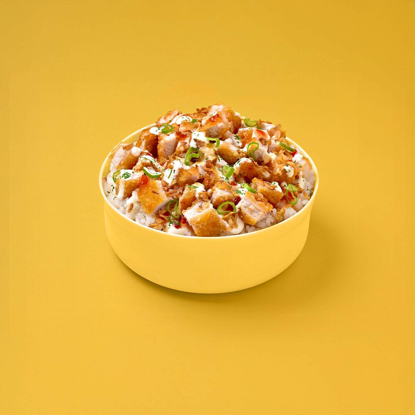 MORCEAUX DE POULET KATSU SUR UN BOL DE RIZ CHAUD, OIGNON FRIT, CÉBETTE, SAUCE SWEET SPICY & SAUCE FROMAGÈRE + 1 side