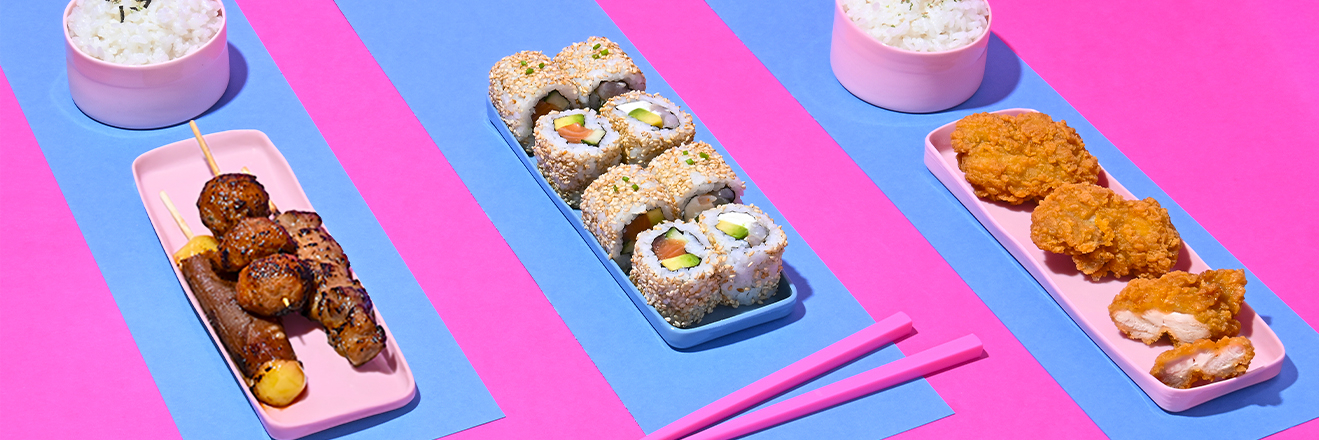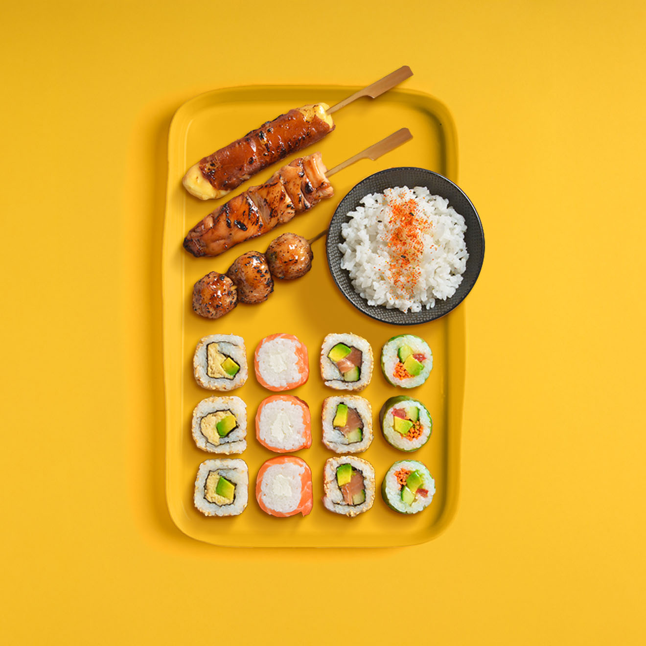3 BROCHETTES AU CHOIX, 3 CALIFORNIA SAUMON, 3 CALIFORNIA POULET, 3 FRESHROLL CHEESE, 3 MAKISLIM VEGGIE + 1 riz nature