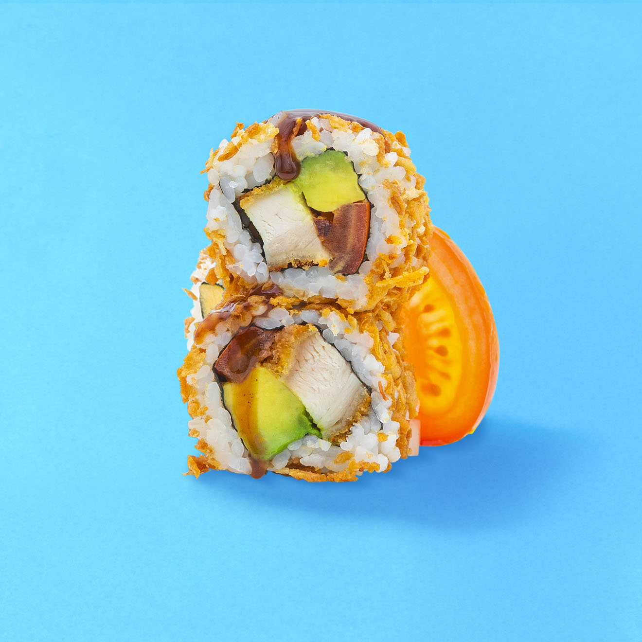 POULET KATSU, TOMATE, AVOCAT, SAUCE TONKATSU, FEUILLE DE NORI, OIGNON FRIT.