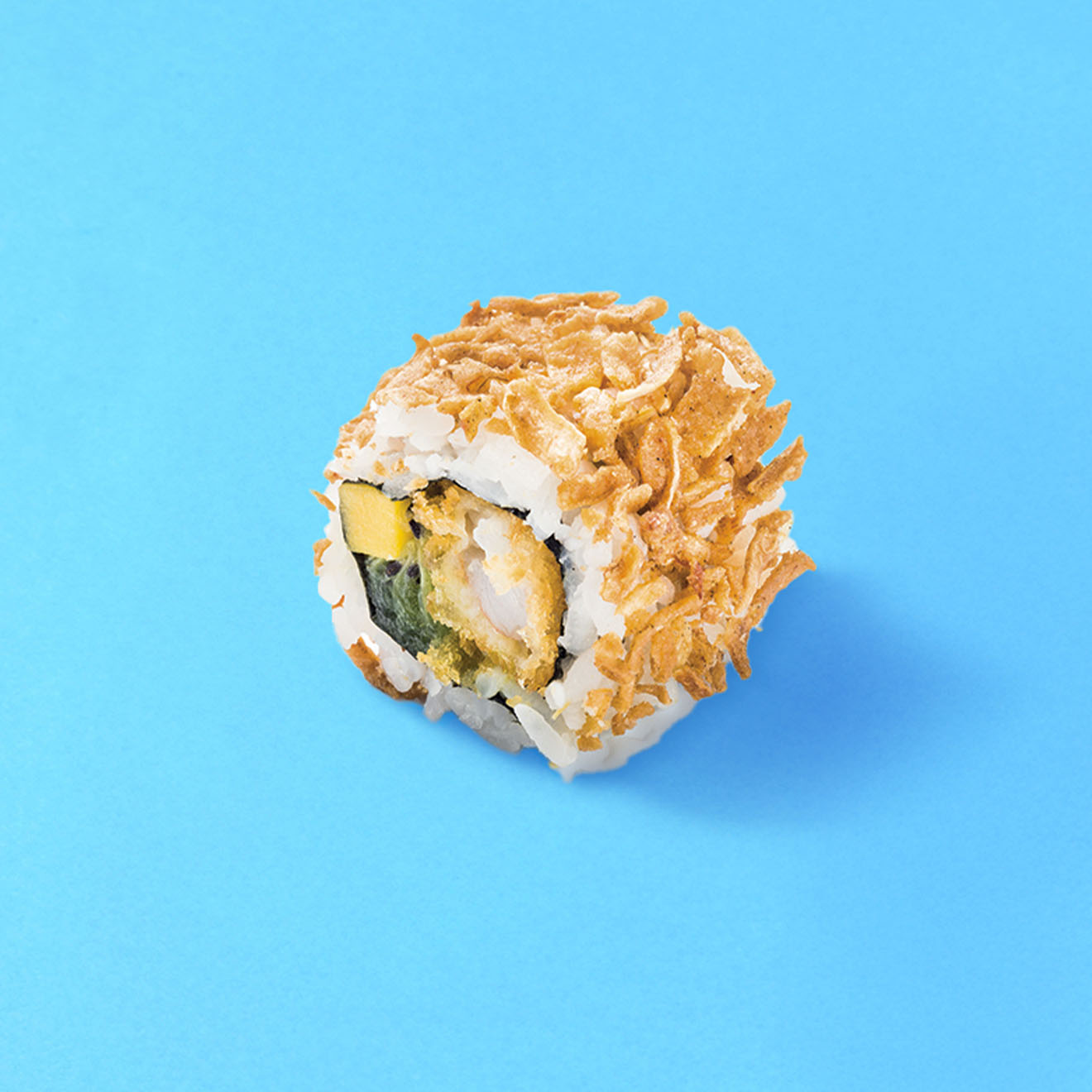 CREVETTE TEMPURA, CREAM CHEESE, SAUCE SPICY MAYO, CIBOULE, PANURE TEMPURA.