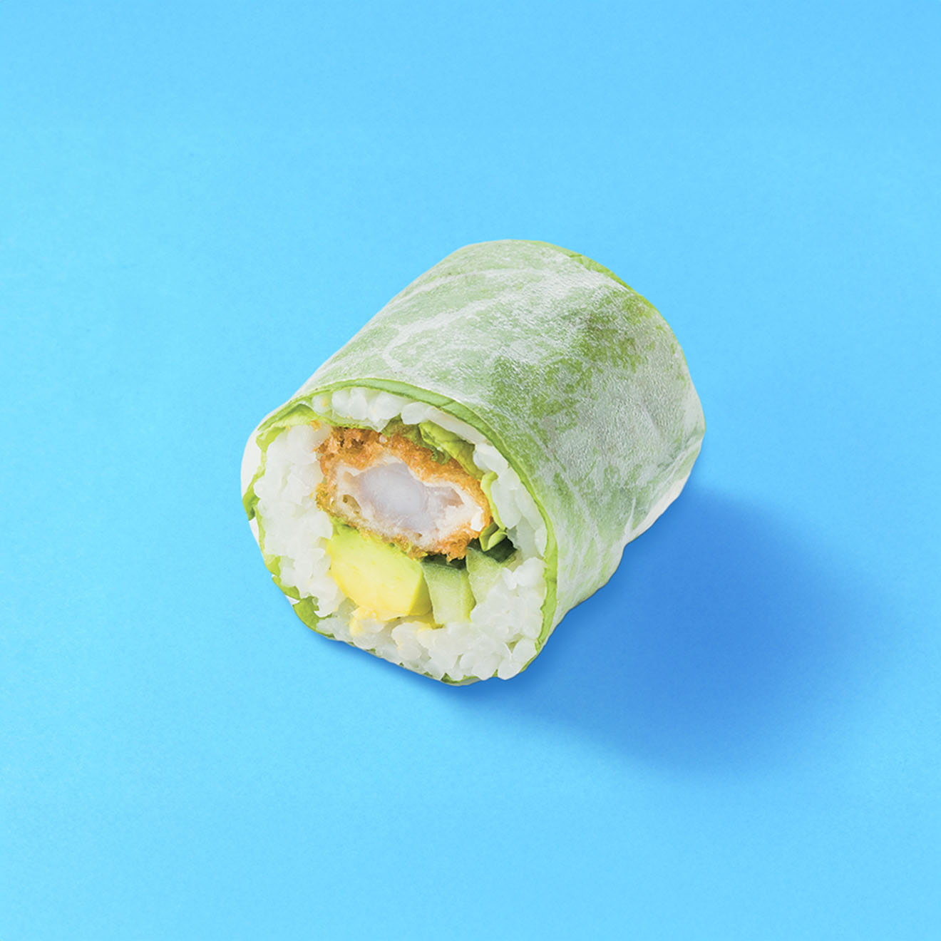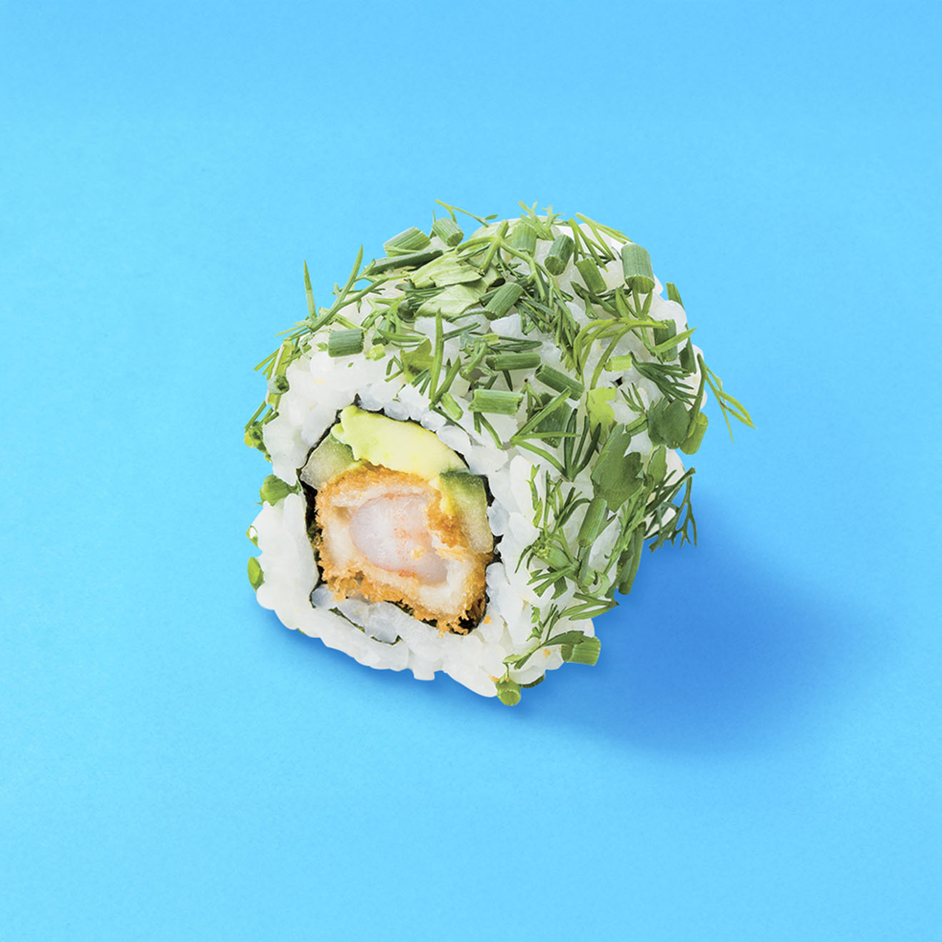 CREVETTE TEMPURA, AVOCAT, CONCOMBRE, ANETH, CIBOULETTE & CORIANDRE.