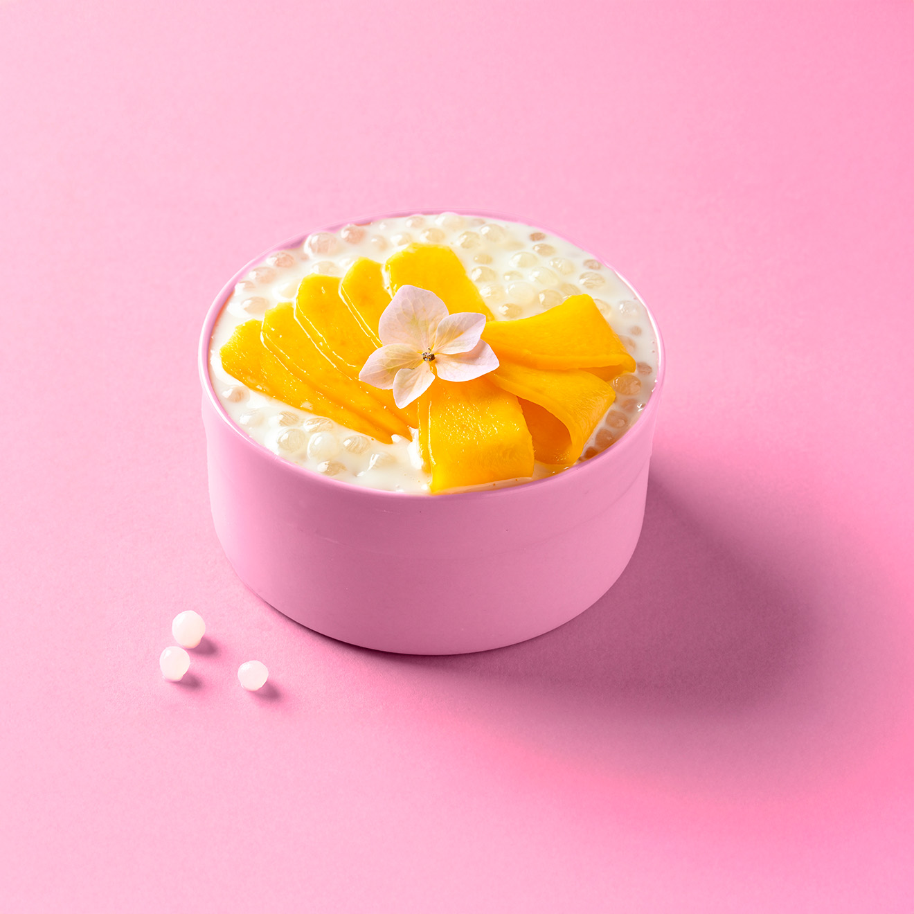 PERLES DE TAPIOCA, LAIT, LAIT DE COCO, SUCRE, MANGUE OU BANANE.